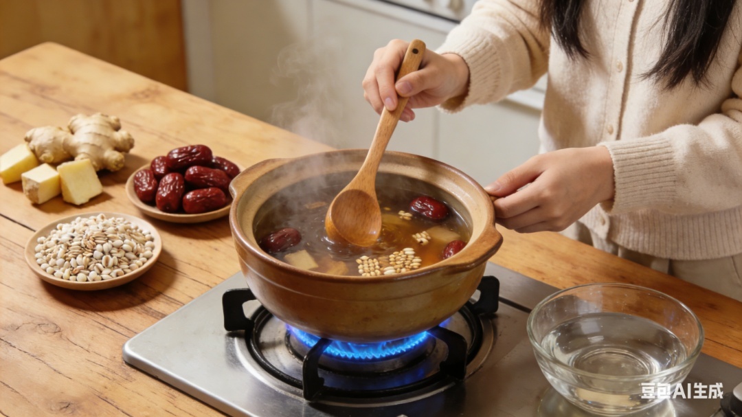 温脾代茶饮:用生姜3片,大枣3颗,炒薏苡仁10克,加水煮15分钟代茶饮。