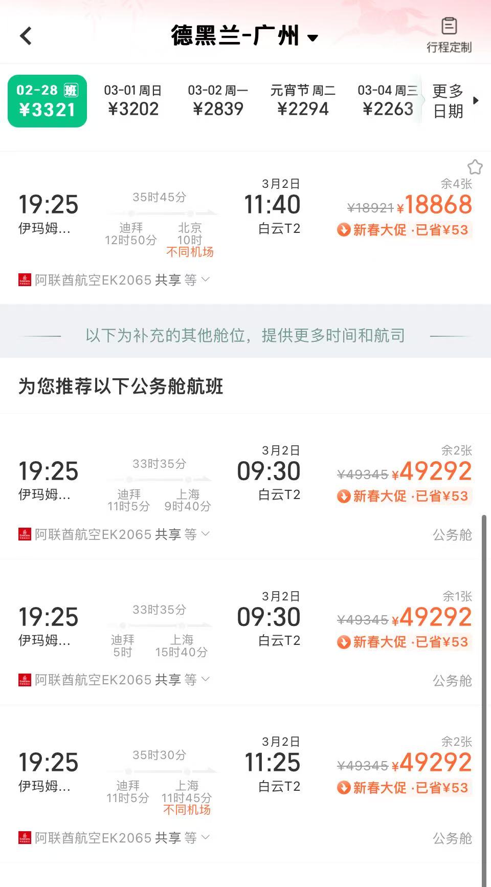 据同程旅行数据显示,2月28日,从伊朗德黑兰飞往北京的机票最低已超过1.6万元,最高达2.1万元;同一天从德黑兰返回上海的航班已无直飞选项,最低票价达4.4万元;而从德黑兰返回广州的公务舱最高票价也接近5万元。